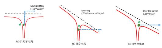 当时,说明激光的电场强度远小于原子的库伦场强,单个光子能量不够大,原子分子中的电子将会吸收足够多的光子进行多光子电离;当γ>>1时,则说明激光的电场强度足够大,能将电子周围的库仑势垒直接压低,此时电子电离主要通过隧穿电离或越垒电离。