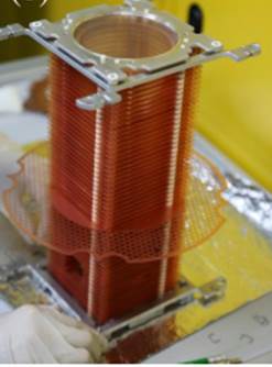 超声分子束进入主腔后与激光焦点交叉,分子发生电离和解离产生电子和离子碎片。带电粒子被施加在多级串联铜片(如图5所示)上的匀强静电场引导至末端的微通道板上(Microchannel Plate, MCP)进行信号倍增。微通道板是由上百万个通道组成的面阵型电子倍增器件。MCP 必须在高真空环境下工作(<10-6mbar),其外侧的金属边带用于施加 1-2kV 的工作电压。当带电粒子(电子、离子甚至是具有一定能量的中性粒子)撞击到通道内壁后,引发雪崩式电子倍增,放大原始触发信号。MCP 出射的次级雪崩电子团,同时携带入射粒子的位置信息,可用延时线探测器对位置信息进行量化编码。单个MCP 内管道与表面成8度夹角, 多层 MCP 之间呈“之”字形排布,对于一个双层 MCP,每个入射电子能激发出 106~ 108个次级电子。
